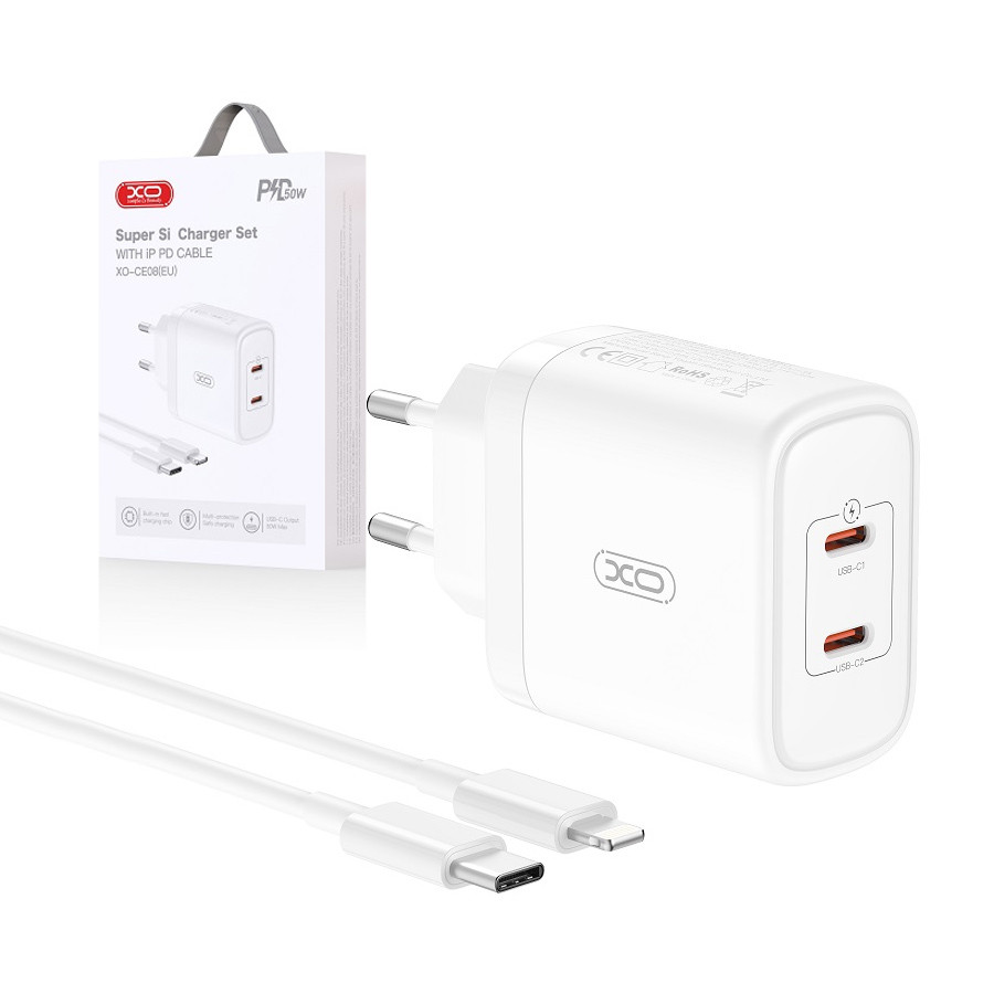 Charger XO CE08 PD 50W 2x USB-C + cable USB-C – Lightning white