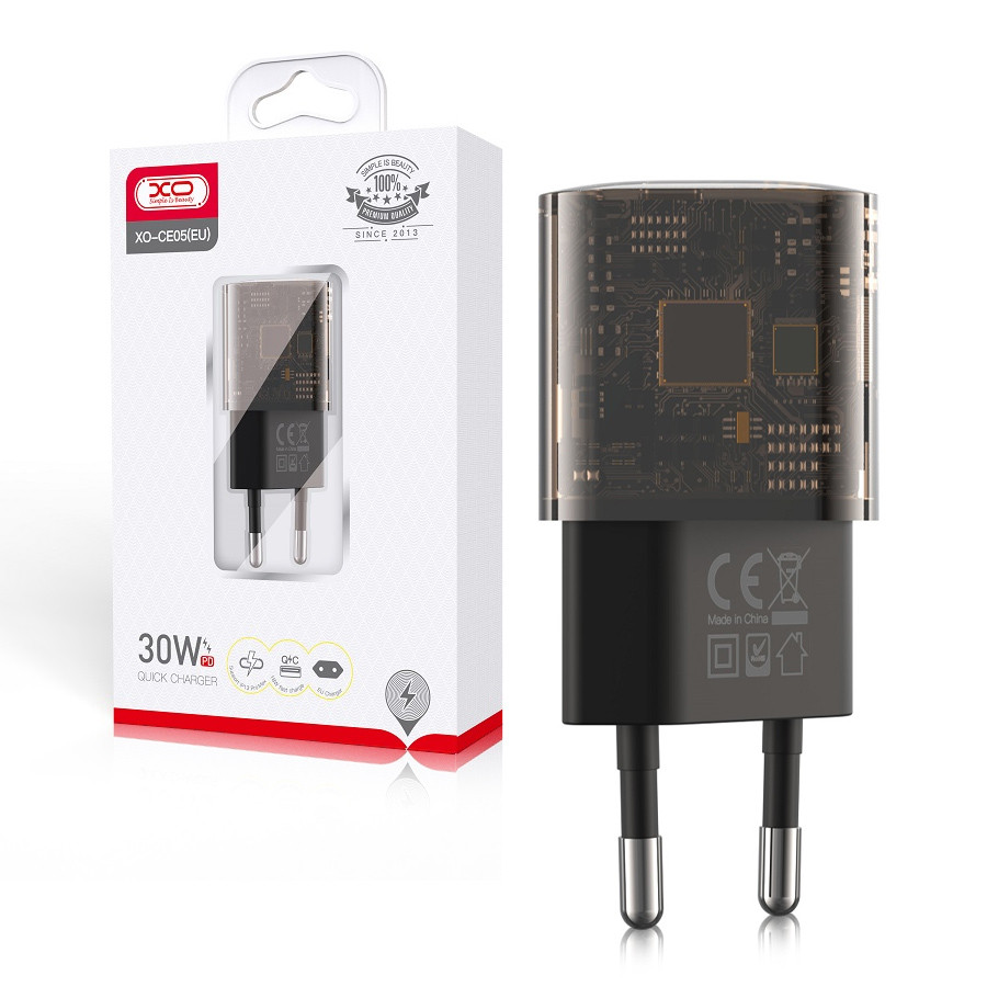 Travel charger XO Clear CE05 PD 30W QC 3.0 18W 1xUSB 1xUSB-C smoked