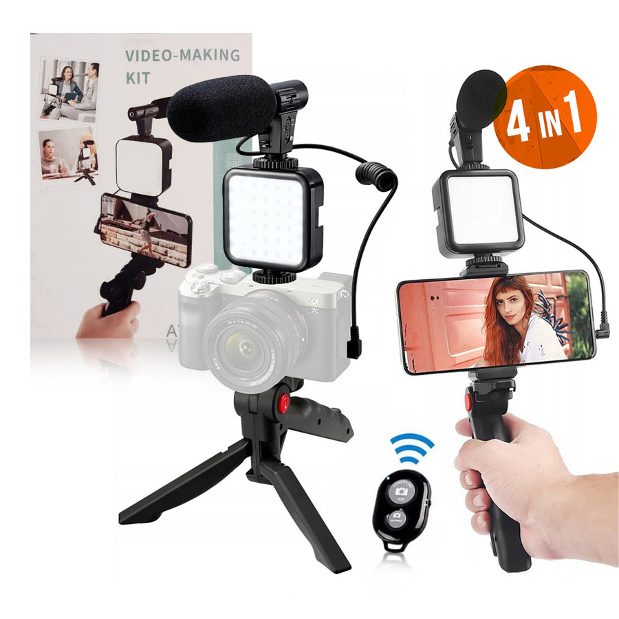 Tripod selfie stick con microfono i lampą - zestaw 4w1