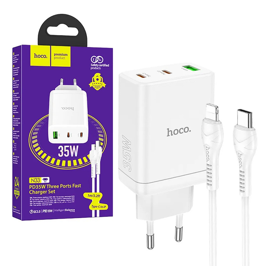 Caricatore HOCO 2x Typ C + USB A + Cavo Typ C/ Lightning QC PD 35W N33 Bianco